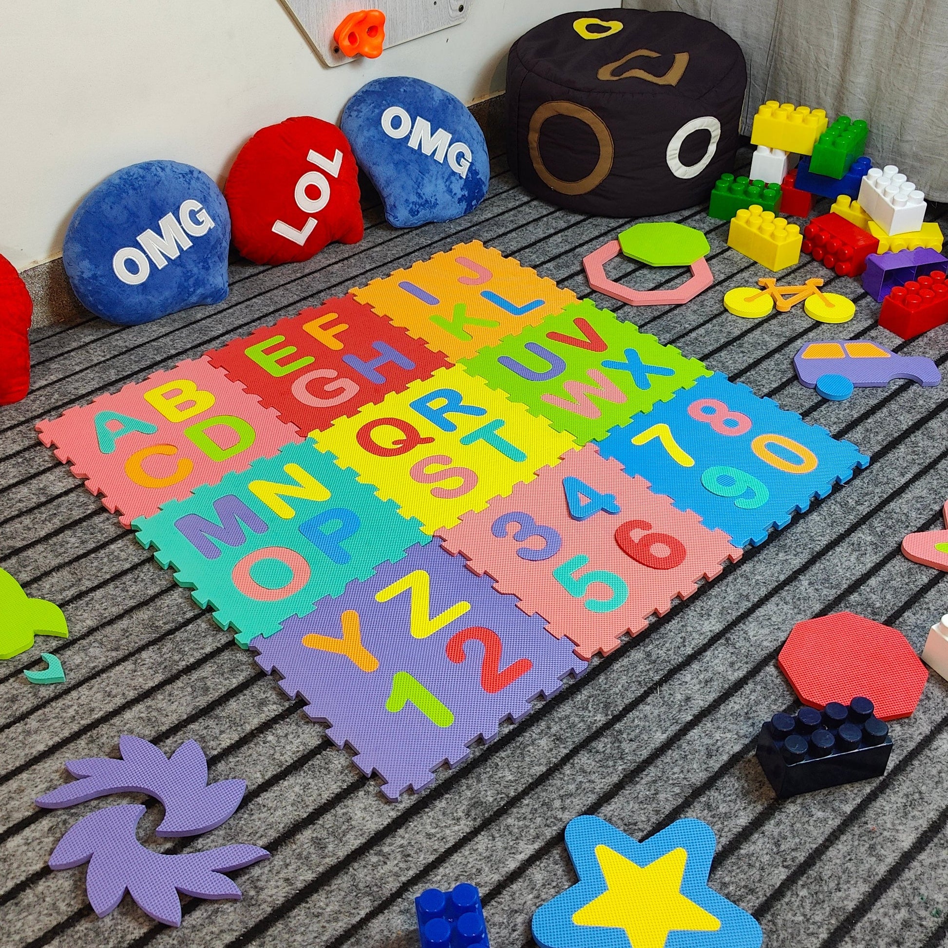 Discover endless hours of educational fun with our Interlocking Foam Puzzle Playmat! Made of high-quality materials, this play mat features 9 colorful tiles and is perfect for kids of all ages. Develop important skills such as problem-solving and hand-eye coordination while learning about different Alphabets , Numbers and colors. Perfect for playrooms, classrooms, and at home.